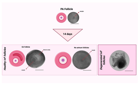 Comparison between healthy follicles after ivF cultures (no antrum and EA follicles) vs. unhealthy follicles after ivF cultures (degenerated follicles). Scale bar: 200 μm. Created with BioRender.com.