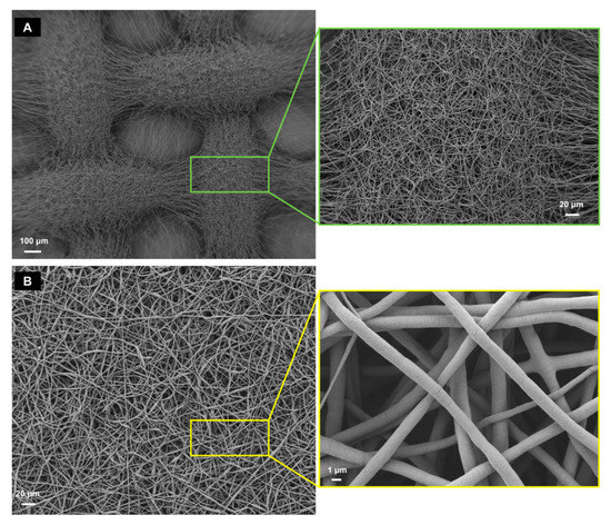 SEM analysis of the PCL-Patterned (A) and PCL-Randomic (B) scaffolds. PCL-Patterned scaffold is reported in A and its zoomed view is shown in a green frame. The scale bars are 100 μm (magnification 100×) and 20 μm (magnification 500×), respectively. The PCL-Randomic is reported in the bottom (B) (magnification 500×) and a higher magnification (10 k× image is shown in a yellow frame. For those images the scale bars are 10 μm and 1 μm, respectively.
