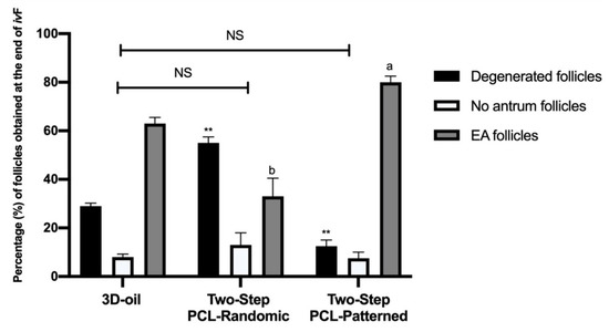 Percentage (%) of degenerated, no antrum and EA follicles per groups at the end of ivF culture. A total of 120, 125, and 122 follicles were cultured in three independent experiments during which 3D-oil, Two-Step PCL-Randomic and Two-Step PCL-Patterned electrospun scaffolds were simultaneal compared (3D-oil: 40, 40 and 40 PA follicles per experiments; Two-Step PCL-Randomic: 41, 42 and 42 follicles PA follicles per experiments; Two-Step PCL-Patterned: 41, 40, and 41 PA follicles per experiments). For each ivF group (3D-oil, PCL-Randomic and PCL-Patterned electrospun scaffolds) 75, 39 and 96 EA follicles as well as 24, 44, and 10 degenerated follicles were collected at the end of in vitro culture, respectively. a,b: statistically significant vs. EA follicles of the 3D-oil group (p < 0.05 and p < 0.01, respectively); **: statistically significant vs. degenerated follicles of the 3D-oil group (p < 0.01). NS: not statistically significant.