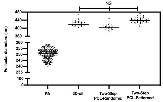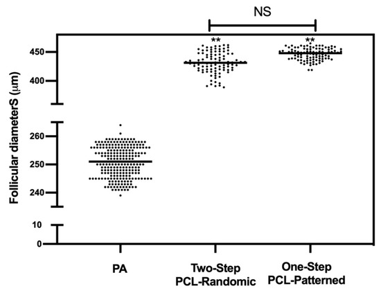 EA follicular mean final diameters: overview for each experimental group. A total of 120 and 120 follicles were cultured in three independent experiments during which Two-Step PCL-Patterned and One-step PCL-Patterned electrospun scaffolds were simultaneal compared (Two-Step PCL-Patterned: 40, 40, and 40 PA follicles per experiment; One-Step PCL-Patterned: 40, 40, and 40 PA follicles per experiment). **: statistically significant vs. PA follicles group (p < 0.01). NS: not statistically significant.
