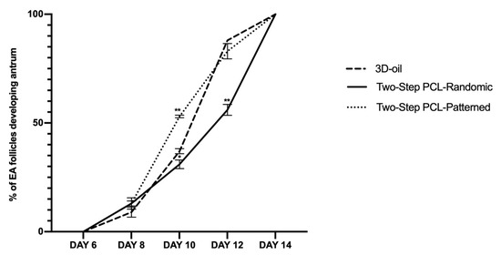 In particular, the antrum formation was accelerated in the Two-Step PCL-Patterned group (53% vs. 31% of PCL-Randomic and vs. 37%; 3D oil at day 10, for both p < 0.0001). A major delay was recorded in the PCL-Randomic group (55% of antrum in PCL-Randomic vs. 83% 3D-oil and vs. 88% PCL-Patterned at Day 12: for both p < 0.0001).