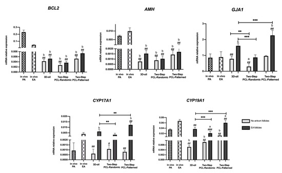 Representative expression of steroidogenic and somatic-specific genes. Twelve follicular walls per group were processed for gene expression analysis. Data were expressed as mean ± SD. **, ***: statistically significant vs. 3D-oil group (p < 0.05, p < 0.01 and p < 0.0001, respectively). #, ##, ###: statistically significant vs. in vivo EA follicles (p < 0.05, p < 0.01 and p < 0.0001, respectively). a,b: statistically significant vs. in vivo PA follicles (p < 0.05 and p < 0.01, respectively). Data in which subscripts are not indicated were considered not statistically significant.