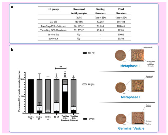 (a) Table summarizing the number of recovered healthy oocytes and their mean diameters at the end of ivF culture. **: statistically significant vs. 3D-oil group. (b) On the left: Percentage of the oocyte meiotic competence acquired in vitro. Different nuclear stages were characterized. a,b: statistically significant vs. recovered healthy oocytes from in vivo PA (p < 0.05 and p < 0.01, respectively); ##: statistically significant vs. recovered healthy oocytes from in vivo EA (p < 0.01); $, $$: statistically significant vs. recovered healthy oocytes from in vivo A (p < 0.05 and p < 0.01, respectively); **: statistically significant vs. recovered healthy oocytes from 3D-oil group (p < 0.01). Data in which subscripts are not indicated, were considered not statistically significant. On the right: Images of oocyte nuclear stages. GV: Germinal Vesicle Break Down; MI: Metaphase 1; MII: Metaphase II (Lacmoid solution staining, 40× magnification: scale bar: 30 μm; insert of the oocytes details; scale bar 30 μm). Created with BioRender.com.