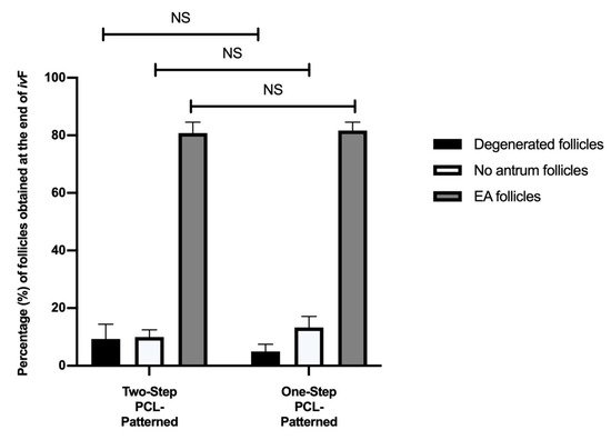 Percentage (%) of degenerated, no antrum and EA follicles per groups at the end of ivF culture. A total of 120 and 120 follicles were cultured in three independent experiments during which Two-Step PCL-Patterned and One-step PCL-Patterned electrospun scaffolds were simultaneal compared (Two-Step PCL-Patterned: 40, 40, and 40 PA follicles per experiment; One-Step PCL-Patterned: 40, 40, and 40 PA follicles per experiment). NS: not statistically significant.