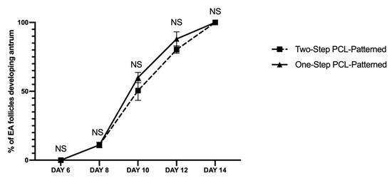 Development trend of the follicular antrum over time according to follicular treatment groups. A total of 120 and 120 follicles were cultured in three independent experiments during which Two-Step PCL-Patterned and One-step PCL-Patterned electrospun scaffolds were simultaneal compared (Two-Step PCL-Patterned: 40, 40, and 40 PA follicles per experiment; One-Step PCL-Patterned: 40, 40, and 40 PA follicles per experiment). Specifically, only follicles that differentiated the follicular antrum during ivF cultures, were tested (97 and 98 EA follicles, respectively, for Two-Step PCL-Patterned and One-Step PCL-Patterned). NS: not statistically significant.