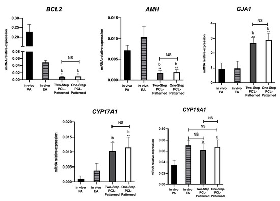 Interestingly, the expression of steroidogenic-related genes (CYP17A1 and CYP19A1), which physiologically increased during the transition from the PA to the EA stage (2.8-fold change increase for CYP17A1 and 1.7-fold for CYP19A1) followed a similar trend and amplitude, particularly in the Two-Step PCL-Patterned scaffold (Figure 7). There were no significant differences between in vivo and in vitro EA for CYP19A1 expression, as well as a slight increase in CYP17A1 was detected in only the Two-Step PCL-Patterned protocol. Furthermore, the process of antrum cavity formation was strictly related to the activation of steroidogenic enzymes as well as of the other follicular gene expressions, independent of the culture conditions.