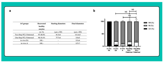 A higher percentage of healthy oocytes were collected from the EA follicles developed under the Two-Step PCL-Patterned-based ivF protocol (80% vs. 33% vs. 63% PCL-Patterned, PCL-Randomic and 3D-oil-derived oocytes, respectively: Figure 8). There were no significant differences between the final oocyte diameters between culture approaches (see Figure 8a).