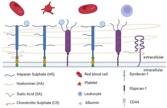 Glycocalyx is defined as a complex gel-like layer of glycosylated lipid–protein mixtures, which surround all living cells and serves as a buffer between cells and the extracellular matrix (ECM) [,,]. The glycocalyx layer is uniform in leucocytes, neurons, fibrocytes, and other cells of mesenchymal origin, whereas it appears thicker at apical than at lateral and basal membranes in epithelial cells [,]. Endothelial glycocalyx layer (EGL) is synthesized and secreted by vascular ECs and extends along the endothelial layer covering the luminal surface of blood vessels []. As is shown in Figure 1, EGL is a glycoprotein network comprising membrane-binding proteoglycans with glycosaminoglycan side chains, glycoproteins bearing acidic oligosaccharides and terminal sialic acids, and plasma proteins (such as albumin and antithrombin) [,]. The syndecan and glypican families are the major proteoglycans tightly bound to the EC membrane [,]. There are five main components of glycosaminoglycan (GAG) side chains: heparan sulphate (HS), chondroitin sulphate (CS), dermatan sulphate (DS), keratan sulphate (KS), and hyaluronan (HA). Among them, HS is the most abundant component in GAG side chains, accounting for 50% to 90% of these chains []. Under normal physiological conditions, GAG chains are highly sulphated, presenting a negatively charged nature [], which facilitates its interaction with plasma constituents []. The charged glycocalyx functions as a macromolecular sieve and negatively repels white blood cells, red blood cells, platelets, and other charged molecules [,,]. Different from other GAG chains, HA is an uncharged, non-sulphated GAG chain, accounting for 5% to 20% of the total GAG chains of the EGL []. HA can form complexes with other sulphated GAG chains to sequester water and stabilize the network of the glycocalyx []. A nonkinase cell surface receptor, CD44, serves as the major membrane receptor for HA [].