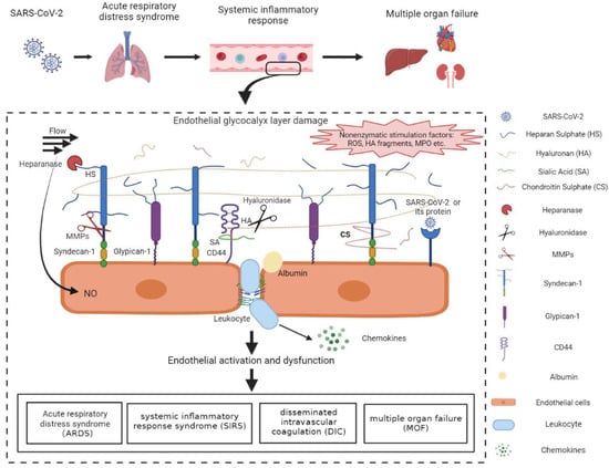 The endothelial glycocalyx layer (EGL) plays an essential role in vascular homeostasis and the EGL damage is closely associated with vascular endothelial dysfunction [,]. A number of studies show that the EGL is damaged in severe COVID-19 patients and the increased plasma levels of glycocalyx components, such as syndecan-1, heparan sulphate, and hyaluronan, were observed as biomarkers, accompanied with high levels of IL-1β, IL-6, TNF-α, hsCRP, and procalcitonin, increasing the risk for COVID-19 severity and mortality [,,,]. Additionally, several drugs that protect EGL from damage are already used in COVID-19, such as heparin and tocilizumab [,,,]. However, though there have been many reports of glycocalyx injury in COVID-19, its mechanism remains to be explored. Here, we reviewed the recent findings of the EGL damage in severe COVID-19. In addition, the mechanisms of COVID-19-induced endothelial glycocalyx damage and the potential therapeutic strategies were also summarized and discussed.