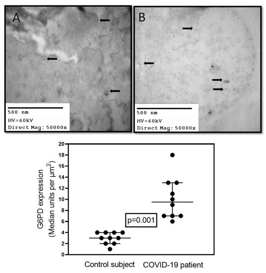Representative immune-electron micrograph of lung. (A) Postmortem sample from a biopsy from a 59-year-old female control subject with hypertension, obesity, type 2 diabetes, and pneumonia. (B) Postmortem sample from a 68-year-old female patient with COVID-19 that had associated comorbidities of ischemic heart disease, type II diabetes, morbid obesity, and hypertension without G6PD deficiency. Two control subjects and two COVID-19 subjects were included. In each subject a lung biopsy was taken, and five electron micrographs × two fields were analyzed, and immunolabeling was performed as previously described by our group [8]. The primary G6PDH antibody (AB 87,230 ABCAM) and a secondary goat-anti-rabbit gold 15 nm (cat: 25,112 Electron Microscopy Sciences) were employed. In panels (A,B), the arrows indicate the presence of the immune colloidal 15 nm gold marker for G6PDH antibody. The images were taken at 50,000× with a Jeol JEM-1011 electron microscope (JEOL Ltd., Tokyo, Japan) to 60 kilovolts equipped with AMT 542.391 analysis software. The histogram represents the densitometry analysis of the gold particle count; the statistical analysis was performed with The GraphPad-Prism 6 Software. Inc. (San Diego, CA, USA), 1992–2012, which was used to generate the analysis and graph. Statistical significance was determined by the Mann–Whitney rank sum test followed by the normality test (Shapiro–Wilk). Difference was considered statistically significant when p ≤ 0.05.