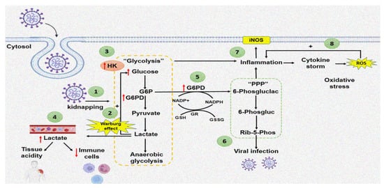 Viruses are obligatory intracellular parasites that depend on the metabolic machinery of the host cell to supply the necessary energy and molecular building blocks needed for successful replication. During replication, viruses modulate the host cell metabolic homeostasis to boost activities such as glycolysis, the PPP pathway, and fatty acid metabolism to fulfill the viral energy requirements. Non-structural and structural proteins and lipids from the membrane bilayer are needed for the synthesis of the viral genome and capsule. The mitochondrial function of the host is also hijacked by different viruses including the SARS-CoV-2, and they shift it from aerobic to anaerobic [8]. Thus, the pyruvate produced from glucose during the process of glycolysis is reduced to lactate. Glucose levels in the cytosol are increased and there is a reduction of the production of adenosine-5-triphosphate (ATP) [9].