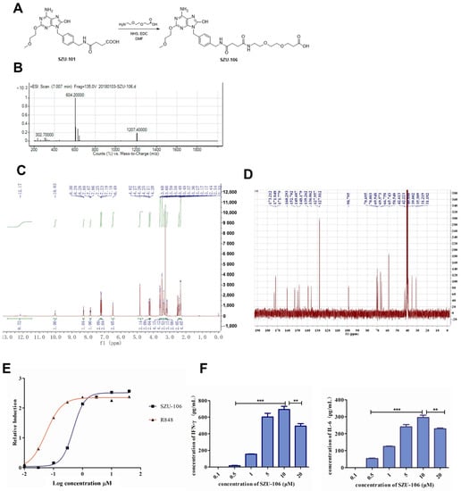 Synthesis of SZU-106 and the activation of TLR7 by SZU-106. (A). The synthesis of SZU-106 from SZU-101 is shown. (B–D). Structure confirmation for SZU-106 was performed with mass spectroscopy, 1H NMR, and 13C NMR. (E). SZU-106 selectively activated TLR7 and increased the expression of SEAP. (F). Cytokine induction in mouse splenic lymphocytes by the TLR7 agonist SZU-106 was evaluated. Data are expressed as the mean ± SD (n = 6) of one representative experiment. ** p < 0.01; *** p < 0.001.