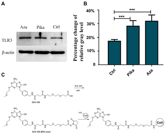 Design and preparation of the whole-tumor-cell vaccine. (A,B). Effect of Aza on the expression level of TLR3 in B16-F10 cells. (A) shows representative Western blots for TLR3 and the loading control (β-actin) in each group. (B) is a bar graph showing the mean ± SD of the percentage change from control TLR3 expression. Data are expressed as the mean ± SD (n = 3) of one representative experiment. The same results were obtained in three replicates. *** p < 0.001. (C) Scheme illustrating the conjugation of SZU-106 to mouse B16-F10 melanoma cells.