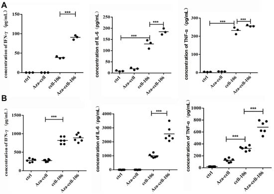 Cytokine release induced by Aza-BFcell-106 in vitro. (A). Aza-BFcell-106 stimulated the secretion of IFN-γ, IL-6, and TNF-α by splenic lymphocytes. (B). Aza-BFcell-106 stimulated the secretion of IFN-γ, IL-6, and TNF-α by BMDCs. Data are expressed as the mean ± SD (n = 6) of one representative experiment. The same results were obtained in three replicate experiments. *** p < 0.001.