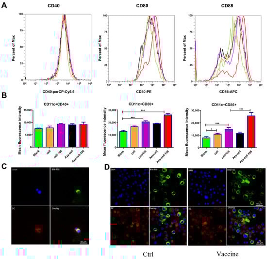 Aza-BFcell-106 promoted the maturation of BMDCs without affecting BMDC phagocytosis. (A). The peak map shows that the peak for Aza-cell-106 is shifted to the right of the peak for the blank group. (B). Average fluorescence intensity was analyzed from the corresponding peak map. The colors representing the different groups were kept consistent between the peak map in (A) and the data in (B). The graph shows the mean ± SD value (n = 3) of one representative experiment. The same results were obtained in three replicate experiments. * p < 0.05; *** p < 0.001. (C,D). DCs (red) phagocytosed B16-F10 cells (green) conjugated with SZU-106. (C) shows the phagocytic function of a single DC. (D) shows the phagocytic function of DCs in the control group and Aza-BFcell-106 group. Blue indicates DAPI staining.