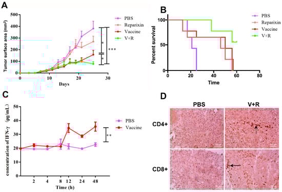 Female C57BL/6 mice (4–6 weeks old, 18–22 g; Laboratory Animal Center, Guangzhou, China) were maintained on a 12/12 h light/dark cycle, with food and water available ad libitum. B16-F10 cells (1 × 105) were resuspended in phosphate-buffered saline (PBS) and subcutaneously injected into the right back of the mice. Tumor growth was measured with a caliper using the ellipse surface formula (Length × Width). When the tumor reached 5 mm in size, we started treatment with a vaccine (s.c., once a week) and reparixin (15 mg/kg, s.c., once every two days). The experiments were repeated 3 times. All procedures were conducted in strict adherence to the Guide for the Care and Use of Laboratory Animals and were approved by the Animal Care and Use Committee of the Health Science Center, Shenzhen University.