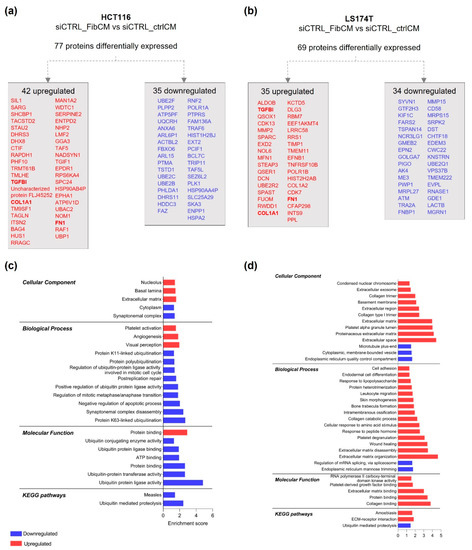 HCT116 and LS174T differentially expressed proteins, upon culture with rhTGFβ1-activated fibroblasts conditioned medium. Significantly up and downregulated proteins in HCT116 (a) and LS174T (b) siCTRL cells cultured with FibCM (siCTRL_FibCM vs. siCTRL_ctrlCM). Protein lists are organized according to the abundance ratio and common proteins to HCT116 and LS174T cells are highlighted in bold (TGFBI, COL1A1, FN1). GO and KEGG pathways analysis of up and downregulated proteins in HCT116 (c) and LS174T (d). The enrichment score was calculated by—log p-value.