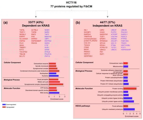 Overall, these results highlighted that from the proteome of HCT116 and LS174T modulated by fibroblasts-secreted factors, 43% and 38%, respectively, is controlled by KRAS. Both cell lines overexpressed proteins associated with extracellular exosome in a KRAS-dependent manner, whereas most of the proteins modulated by fibroblast-secreted factors independently of KRAS were involved in cell–ECM interactions.