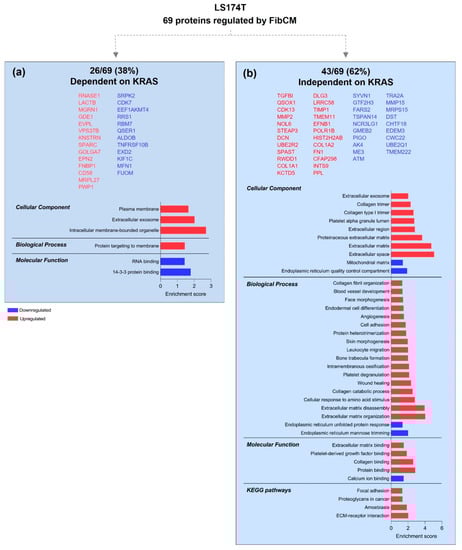 LS174T cells differentially expressed 69 proteins in response to fibroblast-secreted factors (Figure 1c). From these, 26 (38%) were KRAS-dependent—also found in siKRAS cells cultured with FibCM, though differentially expressed; and 43 (62%) were independent of KRAS—only identified in siCTRL cells treated with FibCM (Figure 3a,b and Supplementary File S10).