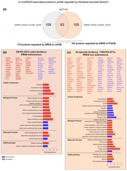 KRAS—autonomously and non-autonomously controlled proteins in HCT116 cells. (a) Venn diagram showing the number of exclusive and common proteins identified in the analyzed conditions (siKRAS_ctrlCM vs. siCTRL_ctrlCM and siKRAS_FibCM vs. siCTRL_FibCM). (b,c) GO and KEGG pathways analysis of shared proteins following the same expression tendency (KRAS-autonomous) (b), and shared proteins with opposite expression tendencies together with exclusive proteins from siKRAS_FibCM vs. siCTRL_FibCM comparison (KRAS-non-autonomous) (c). Protein lists are organized according to the abundance ratio. The enrichment score was calculated by—log p-value.