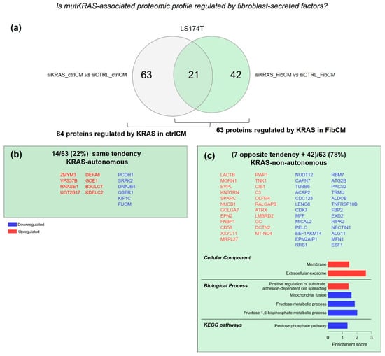 The inhibition of KRAS in LS174T cells under control and FibCM stimulation resulted in the differential expression of 84 and 63 proteins, respectively. The comparative analysis of these two datasets showed 21 proteins common to both conditions (Figure 5a), from which 14 followed the same tendency (14/63—22%, KRAS-autonomous; Figure 5b) and seven followed opposite expression tendencies. These seven proteins were further included in the group of 42 proteins exclusively found in siKRAS_FibCM cells, thus revealing that 78% (49/63) of KRAS-associated proteome is dependent on fibroblast-secreted factors (Figure 5c and Supplementary File S10).