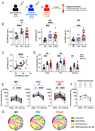 RBD-binding and virus-neutralizing activity of sera from COVID-19 convalescent patients and Gam-COVID-Vac recipients. (A) Study design. (B) Serum IgG (left panel), IgA (middle panel) or IgM (right panel) antibody binding to SARS-CoV-2 RBD, measured by ELISA. IgA and IgM levels are shown as relative units (RU) against a standard convalescent serum. Each dot represents a concentration or RU for each serum sample. The dotted lines indicate the threshold for positivity (anti-RBD IgG = 126 ng/mL, IgA = 33 RU, IgM = 4.0 RU). (C) Spearman’s correlation between the serum levels of anti-RBD IgG and IgA. (D) Virus-neutralizing activity (ID50) of serum samples against lentiviral particles pseudotyped with Spike protein from WT SARS-CoV-2, as well as Delta and Omicron variants. (E) Analysis of serum neutralization activities (ID50) against WT-, Delta-, and Omicron-pseudotyped lentiviral particles. Lines connect ID50 values from the same individual. (F) Summary of virus-neutralizing activities of serum samples against the WT, Delta, and Omicron Spike-pseudotyped lentiviral particles. (G) Chord diagram illustrating the Spearman’s correlations between virus neutralization (ID50) of WT, Delta and Omicron variants and the levels of anti-RBD IgG, IgA, and IgM. Chord widths are proportional to the correlation coefficients, whose numerical values are indicated on the corresponding chords. Black, blue, and red symbols indicate naïve vaccinated (N/V, n = 15), previously SARS-CoV-2 infected Gam-COVID-Vac vaccinated (PI/V; n = 13), and previously SARS-CoV-2 infected unvaccinated (PI/unV; n = 26) individuals. Symbols connected by solid lines (E) represent virus-neutralizing activities considered for each individual. All the experiments were performed at least in triplicate. Data are presented as median ± IQR. The dotted lines indicate the threshold for positivity. Statistics were calculated using the Kruskal–Wallis test (B,D), or the Friedman test for pairwise comparison (E,F). * p < 0.05, ** p < 0.01, *** p < 0.001, **** p < 0.0001, ns, not significant. ID50, half-maximal inhibitory dilution; IQR, interquartile range; RBD, receptor-binding domain; RU, relative units.