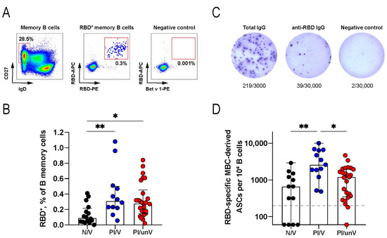 Six months following the event, RBD-specific ASCs above the baseline were detected in 60% (9/15), 100% (13/13), and 96% (25/26) of the subjects from N/V, PI/V, and PI/unV groups, respectively (Figure 2D). Statistically significant differences were only observed for N/V and PI/V groups (p = 0.001) and PI/V and PI/unV groups (p = 0.018). Although RBD-specific ASC numbers were the highest in the PI/V participants, the median value for this group was well below the numbers previously reported for the samples collected during the acute phase of SARS-CoV-2 infection or 85 days following vaccination [22,24]. We did not observe any correlation between the numbers of RBD-binding cells and RBD-specific ASCs. Perhaps this is due to the fact that these B-cell subsets represent different stages of antigen-specific MBCs maturation.