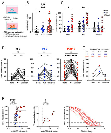 Analysis of MBC-derived antibody response of in vitro reactivated memory B-cells elicited by natural SARS-CoV-2 infection and by Gam-COVID-Vac vaccination. (A) Schematic representation of the MBC-derived antibody assay. (B) Production of RBD-specific IgG in cultures of IL-21/CD40L-stimulated B-cells evaluated using ELISA. (C) Virus-neutralizing activity of MBC-derived antibodies against WT strain and Delta and Omicron variants in different study groups. Infected (% GFP+) cells relative to no antibody controls. (D) Comparison of neutralization activity of individual supernatant samples against WT-, Delta-, and Omicron-pseudotyped lentiviral particles. Symbols connected by solid lines represent virus-neutralizing activities considered for each individual. (E) Summary of virus-neutralizing activities of MBC-derived antibodies against WT strain and Delta and Omicron variants. (F) Spearman’s correlation between the levels of anti-RBD IgG and % of WT virus neutralization (left panel) or ID50 (middle panel). Nine most active supernatants on the left panel are marked with a rectangle. Nonlinear regression curves for virus neutralization of the nine most active supernatants (right panel). Statistics were calculated using the Kruskal–Wallis test (B,C), or the Friedman test for pairwise comparison (D,E). Data are from 3 (B) or 2 (C–F) independent experiments, each in duplicate wells, and the data are shown as median ± IQR. Black, blue, and red symbols indicate naïve vaccinated (N/V, n = 15), previously SARS-CoV-2-infected Gam-COVID-Vac-vaccinated (PI/V; n = 13), and previously SARS-CoV-2-infected unvaccinated (PI/unV; n = 26) individuals. * p < 0.05, ** p < 0.01, *** p < 0.001, **** p < 0.0001, ns, not significant.