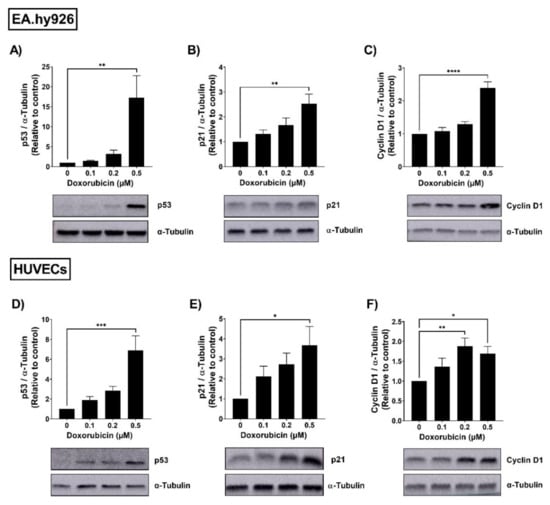 To assess the senescence phenotype in EA.hy926 cells and HUVECs, both cell lines were treated with increasing concentrations (0.1–0.5 µM) of doxorubicin (DOX). Following 24 h treatment with DOX, cells were washed and incubated in DOX-free media for an additional 72 h. Thereafter, the protein expression of the senescence markers p53, p21, and cyclin D1 was assessed. The p53/p21 pathway is activated by the DNA damage response and is involved in cell cycle regulation []. Cyclin D1 is another cell cycle regulator and a downstream target of p53 []. In EA.hy926 cells, DOX treatment resulted in a concentration-dependent upregulation of the expression of p53 (Figure 1A), p21 (Figure 1B), and cyclin D1 (Figure 1C). The highest concentration of DOX (0.5 µM) caused a remarkable 17-fold increase in p53 expression and significant 2.4-fold increases in p21 and cyclin D1. A similar concentration-dependent upregulation of senescence markers was elicited by DOX in HUVECs. The highest concentration of DOX (0.5 µM) caused a significant 6.9-fold increase in p53 (Figure 1D), a 3.7-fold increase in p21 (Figure 1E), and a 1.7-fold increase in cyclin D1 (Figure 1F).