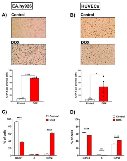The senescence phenotype is characterized by cellular alterations, including enhanced senescence-associated beta-galactosidase (SA-β-gal) activity and cell cycle arrest. We evaluated these changes in EA.hy926 and HUVEC cell lines following treatment with 0.5 µM DOX as described in the methods section. As illustrated in Figure 2A, the percentage of SA-β-gal-positive cells was markedly increased in EA.hy926 cells treated with DOX compared with control cells (75% vs. 9%, respectively). In HUVECs (Figure 2B), a more modest increase in SA-β-gal activity was observed following DOX treatment compared to control cells (47.3% vs. 7.3%, respectively). The cell cycle analysis following the treatment of EA.hy926 cells with 0.5 µM DOX demonstrated a remarkable increase in the G2/M arrested population from 4.1% in the control cells to 60.9% in the DOX-treated cells (Figure 2C). A less remarkable, but still significant, increase in the percentage of cells in the G2/M phase was demonstrated in HUVECs, where the G2/M population increased from 31.6% in control cells to 41.9% in DOX-treated cells (Figure 2D).