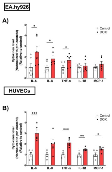 The expression of SASP factors is another important feature of cellular senescence. The expression levels of SASP factors have previously been shown to differ between different cell types [,]. Therefore, we measured changes in the gene expression levels of several SASP factors, including IL-6, C-X-C chemokine ligand 1 (CXCL1), and C-X-C chemokine ligand 8 (CXCL8), induced by 0.5 µM DOX treatment in both EC lines. In EA.hy926 cells, the DOX treatment was associated with significant 2-, 3-, and 1.8-fold increases in IL-6, CXCL1, and CXCL8, respectively (Figure 3A). Similarly, the DOX treatment in HUVECs resulted in a significant 6.4-fold increase in IL-6 and a 3.5-fold increase in CXCL1 (Figure 3B). However, the CXCL8 expression was not significantly changed in HUVECs (Figure 3B). Since SASP includes soluble factors that can be secreted and can affect neighboring cells, we measured the concentrations of IL-6, TNF-α, IL-8, IL-1ß, and MCP-1 in the culture media of both cell lines following DOX treatment. In agreement with the observed increase in the gene expression of SASP factors, the DOX treatment also resulted in the increased secretion of SASP factors in the culture media. In EA.hy926 cells, significant 2.5-, 1.8-, and 1.7-fold increases in IL-6, IL-8, and TNF-α, respectively, were identified in the culture media (Figure 4A). Moreover, an increasing but not significant trend was observed in IL-1ß and MCP-1 (Figure 4A). DOX-treated HUVECs demonstrated a similar upregulation of SASP factors in the culture media. This included significant 3-, 2.1-, 1.5-, and 1.5-fold increases in IL-6, TNF-α, IL-1ß, and MCP-1, respectively (Figure 4B). The IL-8 expression was increased by 2-fold, although this was not found to be significant (Figure 4B).