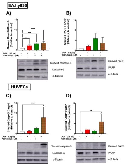 Since apoptosis is the main driver of the senolytic activity of ABT-263, we assessed the effects of ABT-263 on the cleavage of two apoptotic markers in EA.hy926 cells and HUVECs. In EA.hy926 cells, ABT-263 significantly induced the cleavage of caspase-3 in both control- and DOX-treated cells (Figure 6A). Cleaved-PARP was also increased by ABT-263 in control- and DOX-treated cells (Figure 6B), although this was not statistically significant. In HUVECs, ABT-263 selectively triggered the apoptosis of DOX-induced senescent cells, as demonstrated by the significant upregulation of cleaved-caspase 3 (Figure 6C) and cleaved-PARP (Figure 6D) only in the DOX-treated cells, which was in agreement with the cell viability results.