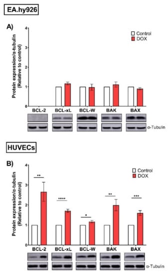 EA.hy926 and HUVECs demonstrate differential protein expression of the BCL-2 family following DOX treatment. Both EA.hy926 cells and HUVECs were treated with 0.5 µM DOX for 24 h. Three days post DOX exposure, cells were harvested and total protein was extracted. Thereafter, protein expression levels of the BCL-2 family including anti-apoptotic members (BCL-2, BCL-xL, and BCL-W) and pro-apoptotic members (BAK and BAX) in (A) EA.hy926 cells and (B) HUVECs were measured via Western blotting (n = 4–6). Representative images of Western blots are shown. Values were normalized to α-tubulin and expressed relative to control cells. Values are presented as means ± SEM. Data were analyzed by unpaired two-tailed t-test. Note: * p < 0.05, ** p < 0.01, *** p < 0.001, **** p < 0.0001.