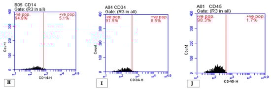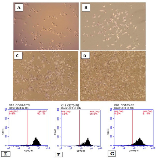All tissue samples were collected after written consent from mothers at the department of obstetrics, Mansoura University Hospital (MUH). After the caesarian section, about 15–20 cm of the umbilical cord was rapidly collected, rinsed in normal saline, and placed in a sterile container with medium (DMEM), penicillin, and streptomycin, then transported to the research facility at Mansoura UNC. The details of all steps of collecting WJ-MSCs from the human umbilical cord were described in a previous work by Yin et al. []. In brief, WJ was collected in a sterile centrifuge tube (falcon 50 mL), rinsed by PBS 7.4 solution, then isolated using 10 mL of collagenase type I and 5 mL of trypsin/EDTA, and centrifuged two times for 10 min at 800× g force. Then, the supernatant was removed, and the pelt was dissolved in 5 mL of complete medium. Then, the solution was transferred to a 25 cm flask and incubated in 5% CO2 at 37 °C. Finally, WJ-MSCs were characterized using a FACS caliber flow cytometer (Beckman, Fullerton, CA, USA) at the children’s hospital at Mansoura University for CD90, CD73, CD105, CD14, CD34, and CD45.