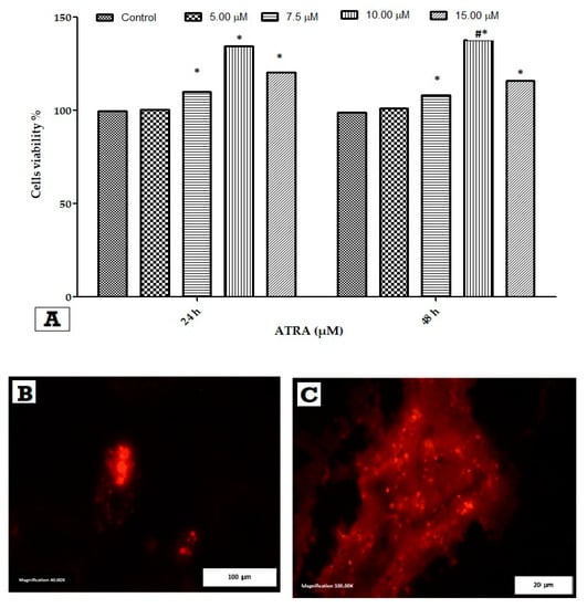 Cell viability was determined using the colorimetric MTT test. The cells were seeded at a density of 10 × 103 cells per well in 96-well plates, then incubated for 24 and 48 h with varying concentrations of ATRA (0, 5, 7.5, 10 and 15 µM). The tissue culture was then treated for 4 h at 37 °C with 3-(4,5-Dimethylthiazol-2-yl)-2,5-diphenyltetrazolium bromide (Sigma Aldrich, St. Louis, MO, USA). The medium was discarded and 100 µL of DMSO (Sigma-Aldrich) was added and incubated for 10 min before measuring the optical density of solubilized formazan at 570 nm with an automatic microplate reader.