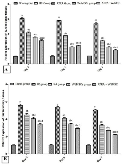 Compared with the sham group, the IRI group showed significantly higher expression for IL-6 and Bax genes in the kidney tissues on days 3, 5, and 7 (p ≤ 0.05). On the other hand, all treated groups (ATRA, WJ-MSCs, and ATRA + WJ-MSCs) showed a significant reduction in the expression of these genes compared to the IRI group (p ≤ 0.05). Moreover, the ATRA + WJ-MSCs group showed a significant decrease in the expression of IL6 and Bax genes in kidney tissues compared with the ATRA and WJ-MSCs groups (p ≤ 0.05) at different intervals (Figure 3A,B).