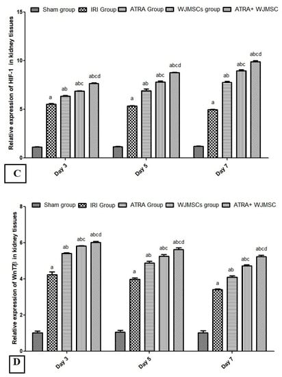 The expressions of HIF-1alpha, Wnt7beta, and beta-catenin were significantly increased in kidney tissues of the IRI group compared with the sham group on days 3, 5, and 7 (p ≤ 0.05). However, all treated groups (ATRA, WJ-MSCs, and ATRA + WJ-MSCs) showed statistically significant higher values of these tested genes compared with the IRI group (p ≤ 0.05). Moreover, the ATRA + WJ-MSCs group showed a significant increase in HIF1α, Wnt7beta, and beta-catenin expressions in kidney tissues compared with the ATRA and WJ-MSCs groups (p ≤ 0.05) at different intervals (Figure 3C–E).