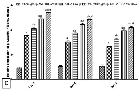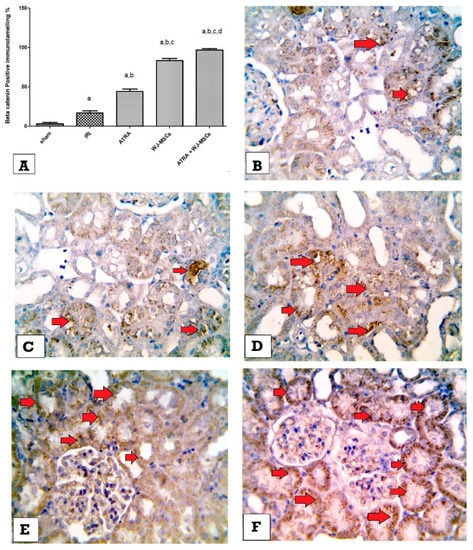 Immunohistochemical examination revealed a significant increase in beta-catenin expression in kidney tissues of the IRI group compared with the sham group (p ≤ 0.05). On the other hand, β-catenin expression levels were significantly increased in all treated groups compared with the IRI group (p ≤ 0.05) and were the most significant in the ATRA + WJ-MSCs group compared with the IRI control group on day 5. Moreover, the ATRA + WJ-MSCs group showed a significant increase in β-catenin compared with the ATRA and WJ-MSCs groups (p ≤ 0.05) on day 5 (Figure 5A–F).
