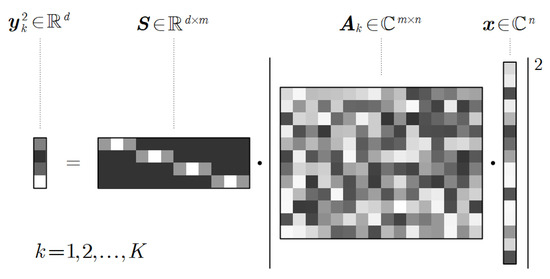 The introduction of the down-sampling matrix makes the forward model of Equation (1) different from that of classical phase retrieval problems. It arises from the fact that all the photons incident upon a same pixel are converted into a single intensity signal. Mathematically, the intensity signal can be regarded as a weighted sum of the signals of the corresponding subpixels. In many works, uniform weights are adopted. Nevertheless, in practice, the fill factor of the sensor pixels is usually less than one, thus the weights for different subpixels may be different. A more accurate sampling model can be obtained by experimentally calibrating the intensity response of the sensor pixels, as was well done in [7]. Note that this down-sampling process is quite similar to the single pixel imaging model, despite the fact that we are using array sensors [52]. The model described by Equation (1) subsumes a special case the classical phase retrieval problem when and is an identity matrix.