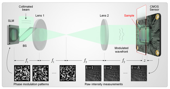 Lensless on-chip microscope based on phase modulation diversity, which we consider as an example in this work. BS is a beam splitter. and denote the focal lengths of Lens 1 and Lens 2, respectively. z denotes the sample-to-sensor distance.