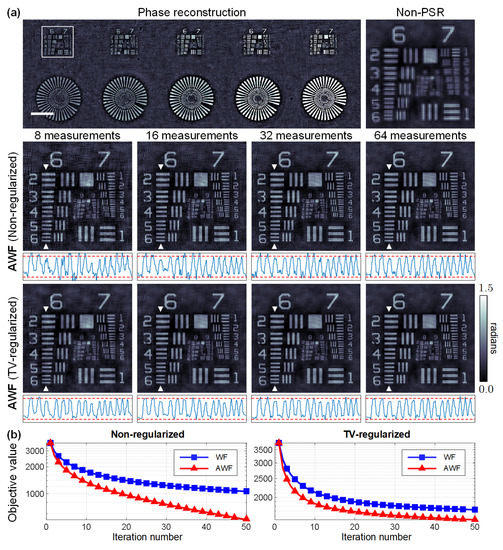 We first evaluated the proposed method via imaging a quantitative phase microscopy target (Benchmark Technologies, Lynnfield, MA, USA). The up-sampling ratio was set to , leading to a higher imaging resolution than the classical non-PSR phase retrieval method. Reconstruction via the non-regularized and the TV-regularized PSR phase retrieval models was implemented using , 16, 32, and 64 intensity images, respectively. In the optical experiments, the artifacts arise not only from the measurement noise, but also from the modeling errors of the imaging system that are inevitable in practice. The TV regularization can help reduce the artifacts while preserving high-frequency details, as is visually demonstrated by the phase images and quantitatively verified by the cross-sectional phase profiles in Figure 5a. The ground truth values of the phase structures were calculated by , where h denotes the height of the structure, denotes the refractive index of the medium, and w denotes the illumination wavelength. Figure 5b indicates a similar improvement to the convergence rate using AWF compared with WF. Considering the inevitable modeling errors of the imaging system, the algorithms tend to converge earlier on experimental data.