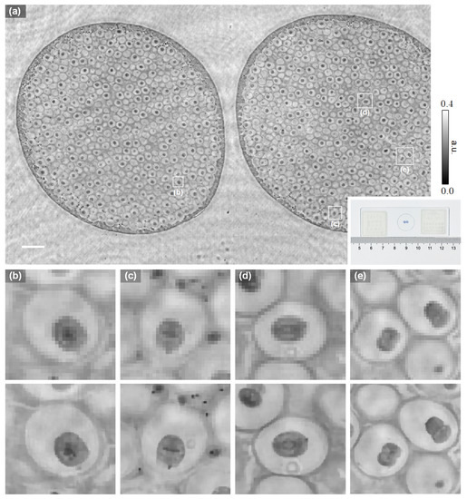 Experimental validation on biological samples.(a) Amplitude reconstruction of a section of the uterus of parascaris equorum. The inset shows an image of the stained tissue slide. (b–e) are the enlarged images of (a), corresponding to the prophase, metaphase, anaphase, and telophase of the mitosis, respectively. The upper and lower rows show the non-PSR and PSR reconstruction, respectively. The scale bar is 200 m.