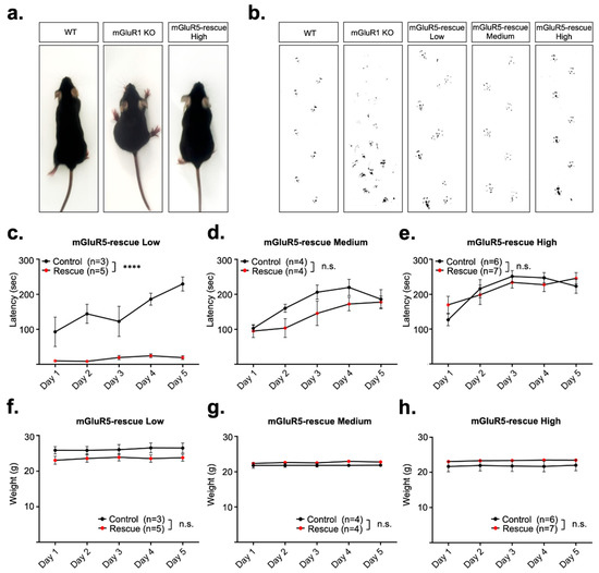 (a) Photographs of a wild-type (WT), an mGluR1-KO and an mGluR5-rescue High mouse are shown. mGluR1-KO mouse shows hindlimb spreading, which is improved in mGluR5-rescue mouse. (b) Hind limb footprint patterns. (c–e) Rotarod test in control mice and mGluR5-rescue Low (c), Medium (d), and High (e) mice. The latency to fall from a rotating rod is plotted versus the training day. (f–h) Weight of mice used in the rotarod test on each test day is shown. Low (f), Medium (g) and High (h). Data are expressed as mean ± SEM. **** p < 0.0001. n.s., not significant.