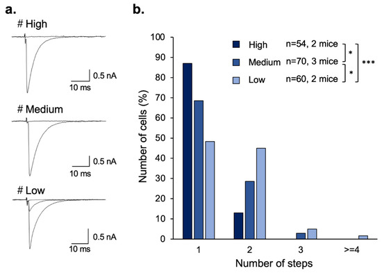 Sample records (a) and summary graphs (b) of CF-EPSCs from adult mGluR5-rescue PCs. Summary graphs show frequency distributions of PCs in terms of the number of discrete steps of CF-EPSCs from mGluR5-rescue High (n = 54 from 2 mice), Medium (n = 70 from 3 mice), and Low (n = 60 from 2 mice) mice. * p < 0.05, *** p < 0.005.