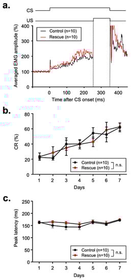 (a) Temporal relationship between the CS and US in eyeblink conditioning. A temporal overlap of the US with the preceding CS can be observed. The averaged EMGs of control mice and mGluR5-rescue mice were imposed under the CS-US time course. (b) CR acquisition as a motor learning curve in the control mice and mGluR5-rescue mice. In the acquisition session of day 1 to day 7, daily session consisted of 10 blocks of trials, with each block consisting of nine CS–US paired trials. (c) CR peak latency during the eyeblink conditioning in the control and mGluR5-rescue mice. In this analysis, we used mGluR5-rescue High mice. Data are expressed as mean ± SEM. n.s., not significant.