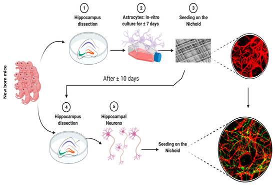 Since astrocytes and neurons in the rodent central nervous system (CNS) appear to be regional and cortical-layer-specific in terms of the numbers and dimensions of axons and dendrites as well as functions, we decided to use mouse astrocytes and neurons from the same brain area: the hippocampus (Figure 1).