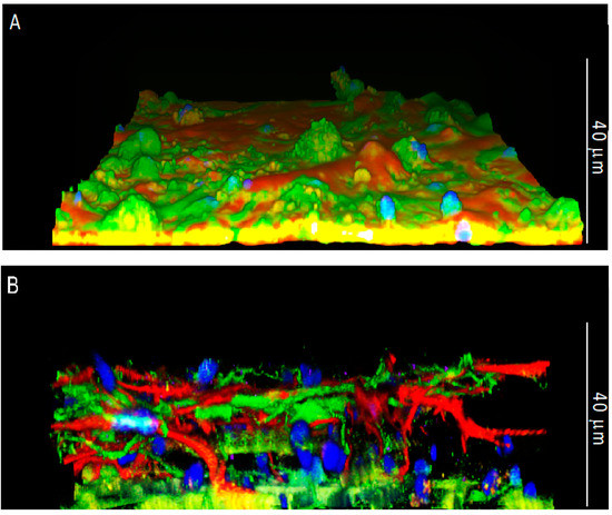 The confocal microscopy technique was adapted from a protocol previously described [33]. Briefly, samples were acquired using a Nikon A1 confocal microscope, and images were collected using 20× and 40× objectives with stack thicknesses of between 0.24 and 0.48 μm. The obtained images were processed with the Nikon NIS-Elements platform and the open-source platform for biological image analysis [34].