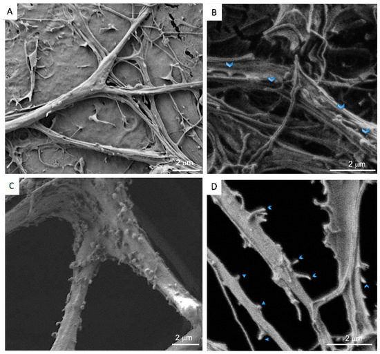 Using SEM, we compared the morphology of the protrusions between the 2D and 3D neurons (Figure 5A,B). After 21 days, the neurons in both the 2D and 3D cultures showed mature protrusions belonging to two categories: filopodia and mature spines (Figure 5C,D).