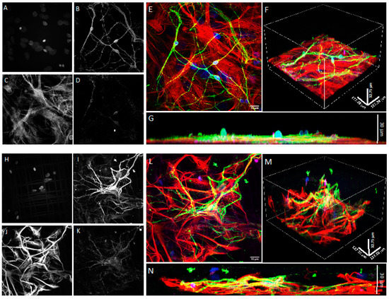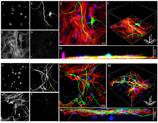 Upon seeding in the 3D microscaffold, we expected that the majority of cells would fall by sedimentation, primarily distributed at the bottom of the Nichoid. However, a large number of astrocytes anchored to the walls of the Nichoid, also colonizing the empty spaces between the structural micro trusses that form the microscaffold architecture. Instead, in line with the 2D culture, neurons followed the distribution of the astrocytes by growing on top of them. These differences could be due to the structure of the Nichoid that strongly modifies the cell adhesion configuration and reflected cytoskeletal organization, as we have previously demonstrated for mesenchymal stem cells and neural progenitors [42,43]. In addition, it seems that astrocytes in 3D culture self-organize in well-differentiated domains, as happens in the brain parenchyma, as opposed to the 2D substrate where they were mainly overlapping each other (Figure 2A–D). In the 2D culture, astrocytes formed a confluent monolayer, with cells covering the available surface (Figure 3A). On the contrary, cells seeded on the 3D Nichoid penetrated the internal structure of the microscaffold (Figure 3B). Concerning neurons, their morphology appeared similar between the 2D and 3D cultures. However, in the 3D culture, neurons were also contacting not only the surrounding neurons and astrocytes but also the niche’s 3D structure (Figure 3B).