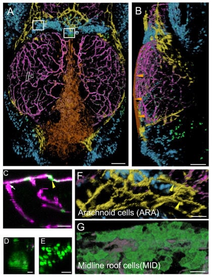 - Arachnoid cells (ARA), color-coded in yellow. This population of cells with strong, positive EGFP staining was located in the so-called arachnoid space [,] at the periphery of the OT, at the surface of the cisterns [,,], adjacent to the telencephalon and cerebellum (Figure 1A,G). In mammals [,], the subarachnoid space also extends between the telencephalon and midbrain, and between the midbrain and cerebellum. These EGFP-positive cells in the arachnoid space clearly did not constitute a homogeneous barrier at this stage. The cells had a typical rectangular elongated shape (Figure 1), as reported for the interstitial epithelial cells of the arachnoid in rat cell cultures []. Some of these EGFP-positive cells presented granulations resembling those of mammalian arachnoid cells (Figure 1G) [].